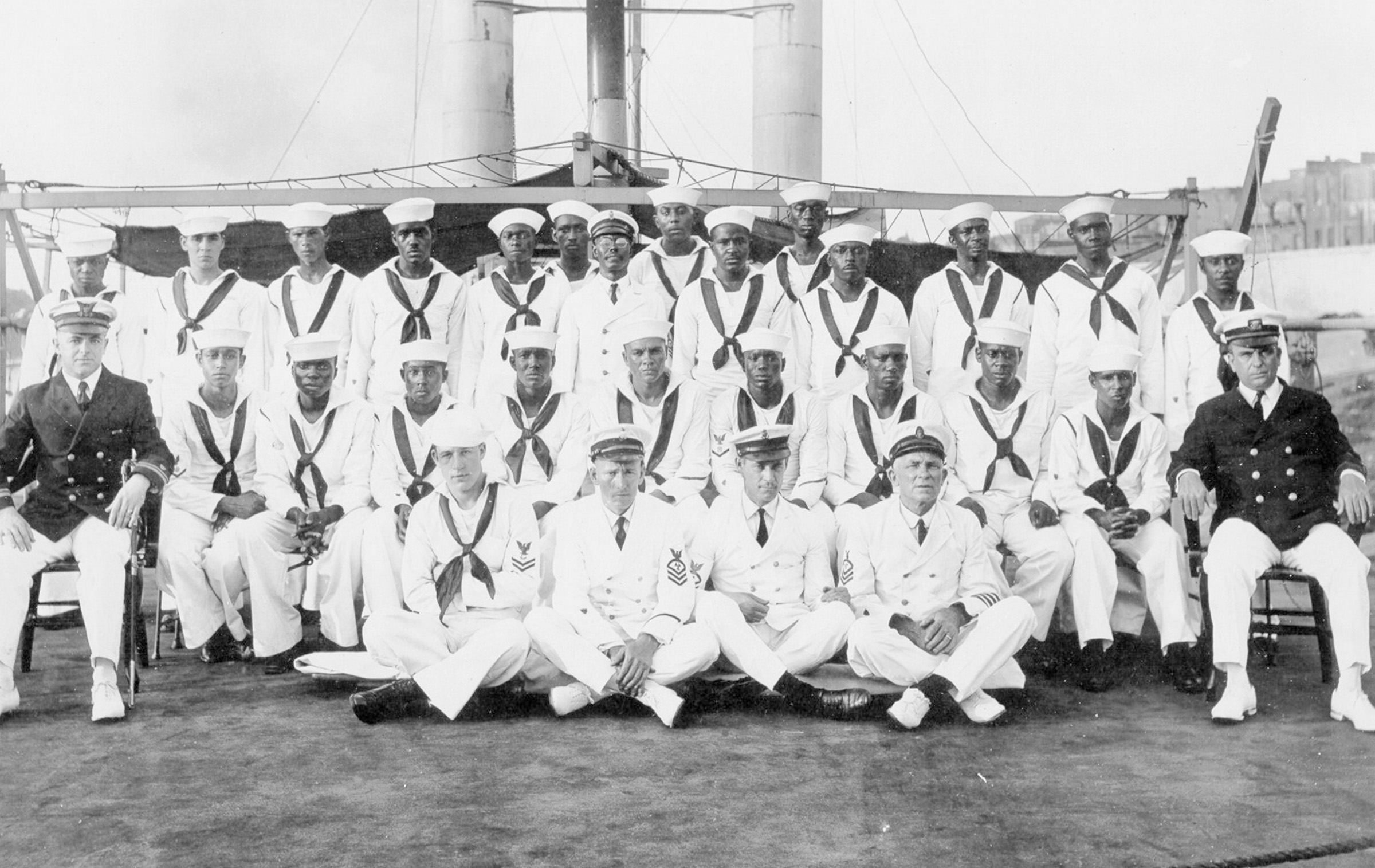The integrated crew of the cutter Yocona photographed in 1925. Unlike officially desegregated cutters in World War II, Yocona had white officers and non-commissioned officers with an all-black enlisted force. (Coast Guard Collection)
