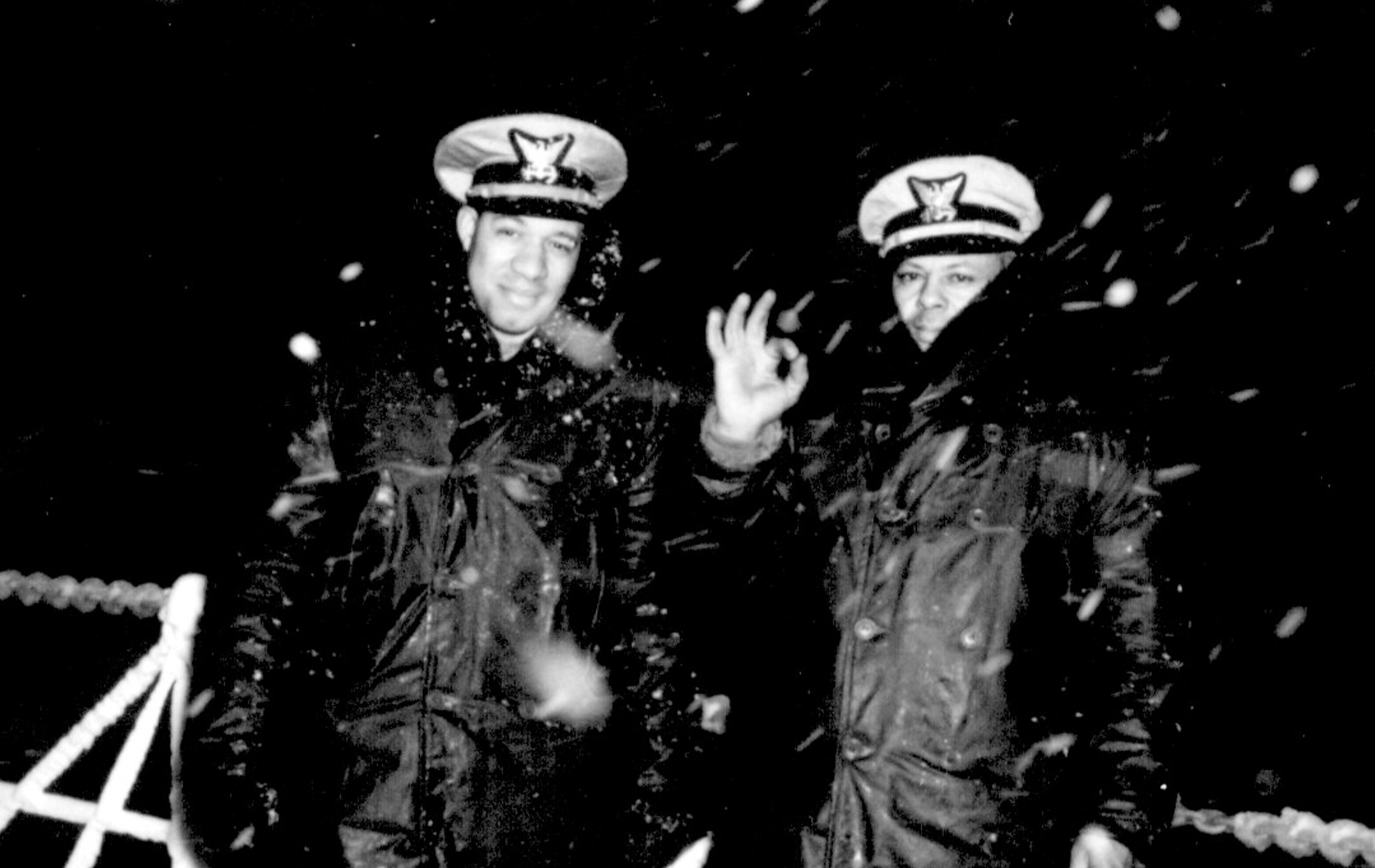 Photo of lieutenants Joseph Jenkins and Clarence Samuels, two African American officers standing on the rolling decks of the cutter Sea Cloud in the North Atlantic. These men were the first recognized African American officers in the Service. (Coast Guard Collection)