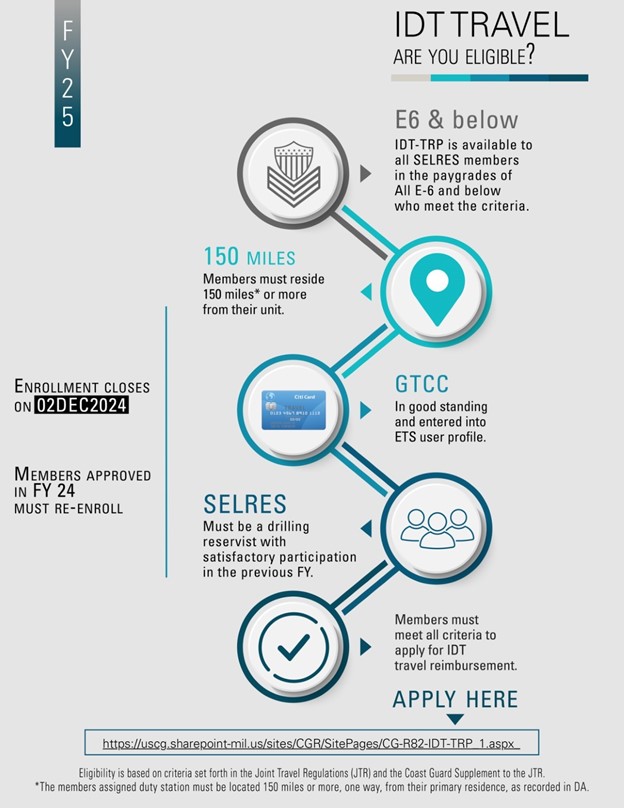 Rear Adm. Tiffany Danko, Assistant Commandant for Reserve, authorized the expansion of the Reserve Inactive Duty Training - Travel Reimbursement Program (IDT-TRP) to eligible E6 & below Selected Reserve (SELRES) members!