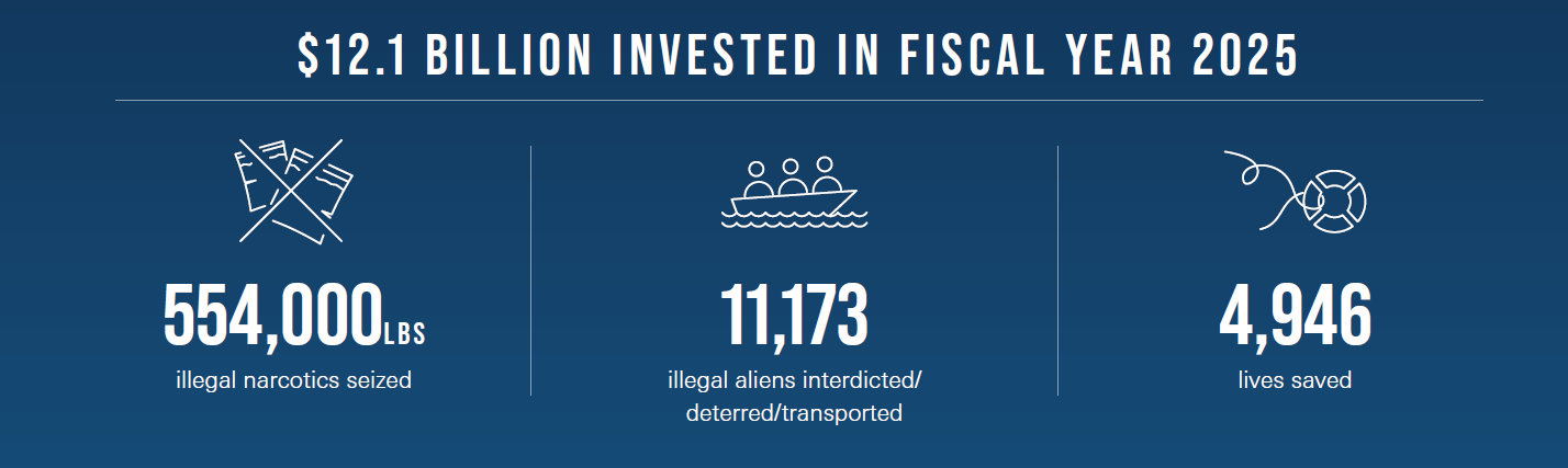 The Coast Guard’s continued governance and protection of the Marine Transportation System enabled the safe movement of 1.8 billion tons of cargo in FY25—an increase of more than 13 percent from FY24—returning more than $28 billion in value to the American people.