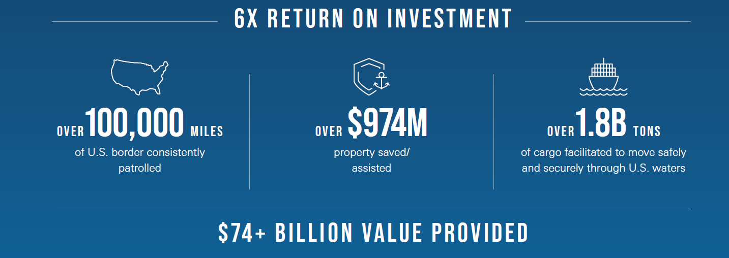 Through disciplined and aggressive stewardship of its $12.1 billion annual budget, the Coast Guard delivers an unmatched return on investment for the Nation. Conservative analysis shows the Service generates more than $74 billion in social and economic value through cost avoidance—representing a 6-to-1 return on taxpayer investment.
